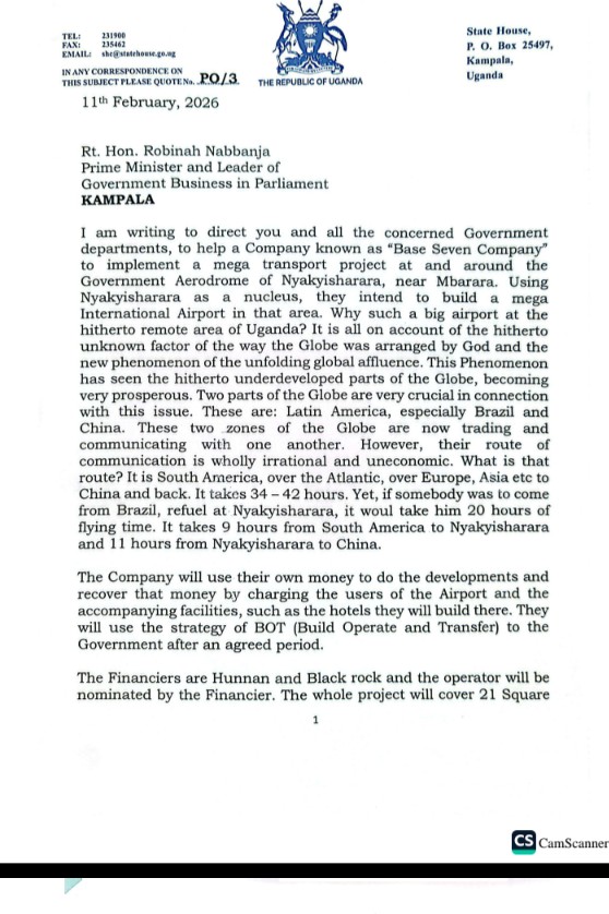 In a letter dated February 11th, 2026, President Museveni directed Prime Minister Nabbanja to oversee displacement and compensation of people occupying the land where the project will be constructed.